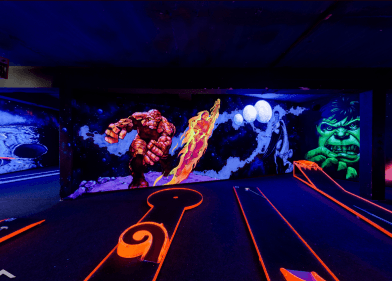 “In het donker golfen was nog nooit zo leuk. Dankzij de blacklights en de wanddecoraties ziet de wereld er opeens heel anders uit.”